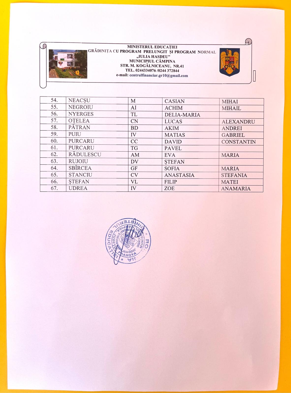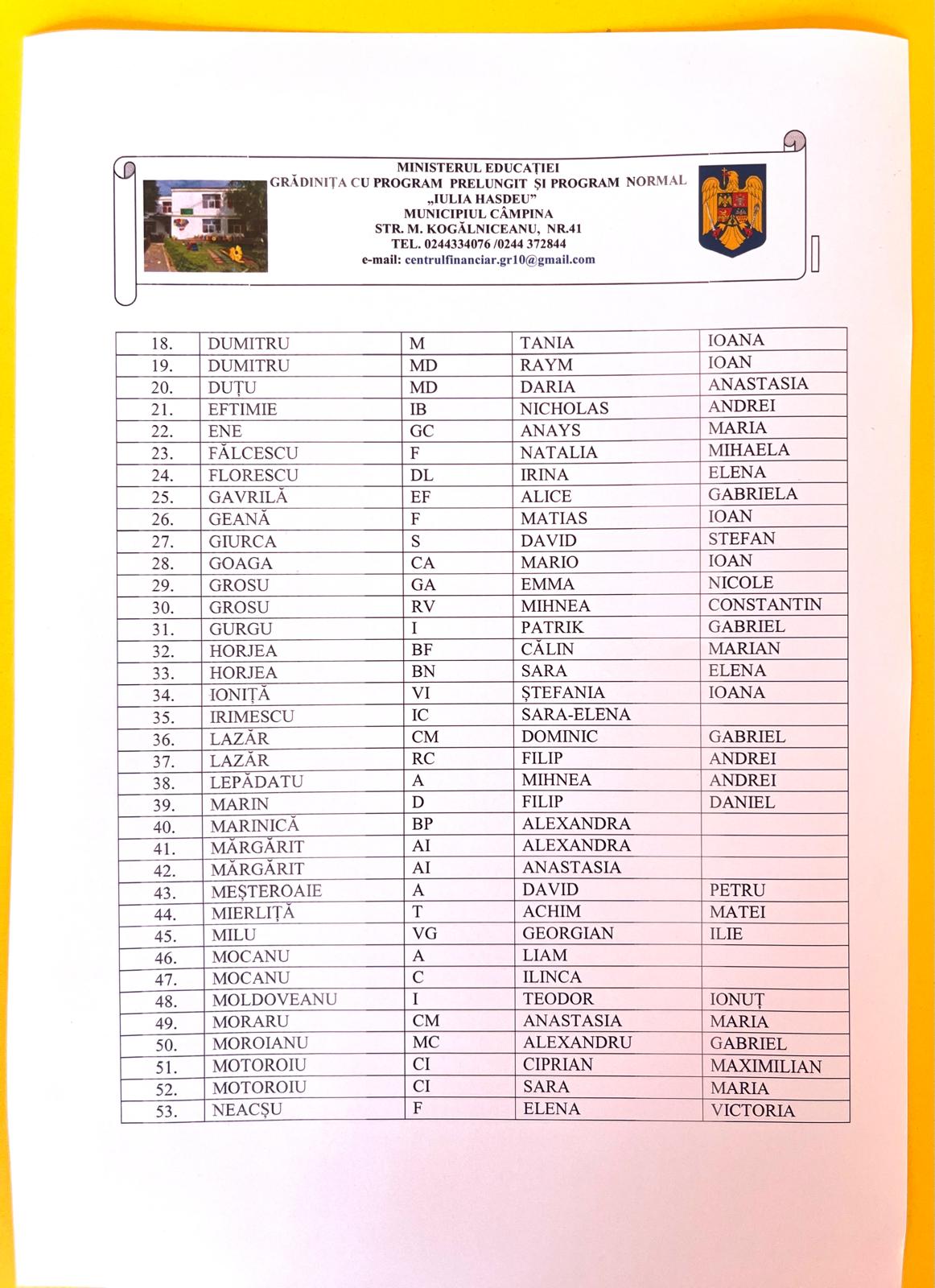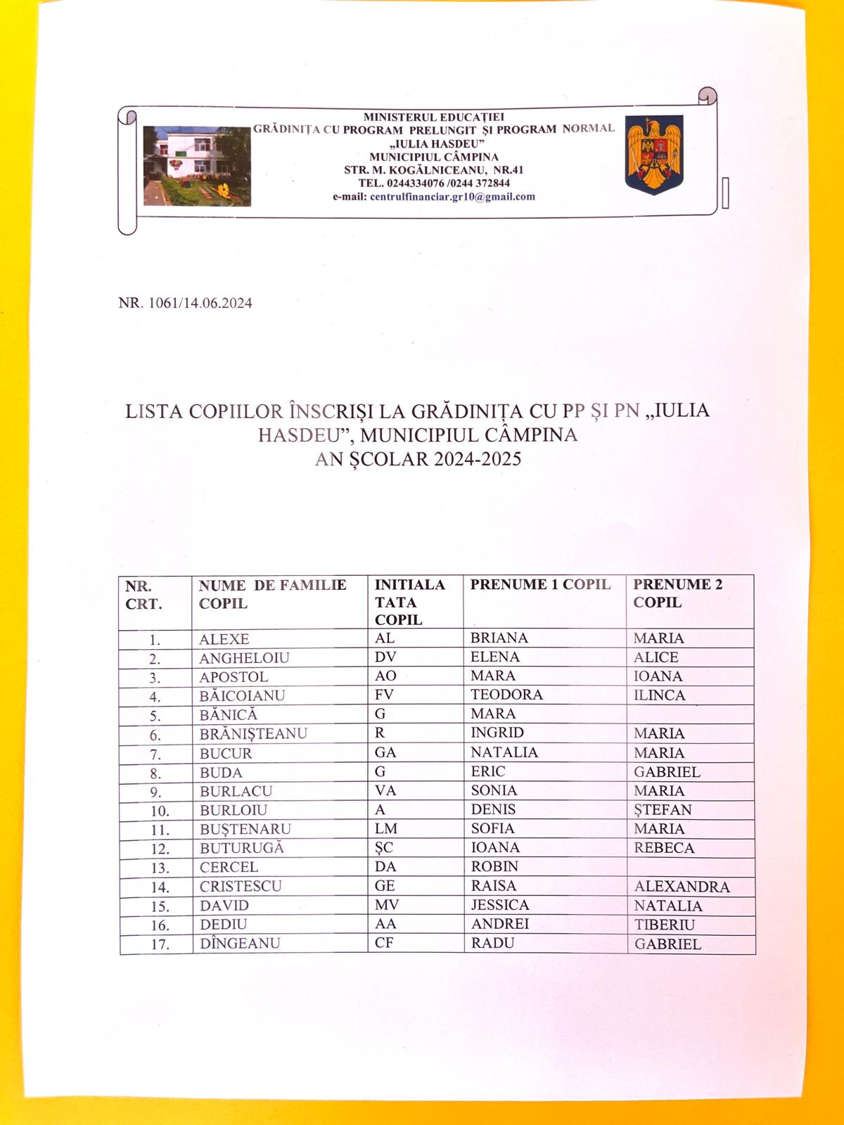 LISTA COPIILOR ADMISI LA GRADINTA IN ANUL ȘCOLAR 2024-2025 și LOCURILE DISPONIBILE PENTRU ANUL ȘCOLAR 2024-2025, ETAPA a II-a.