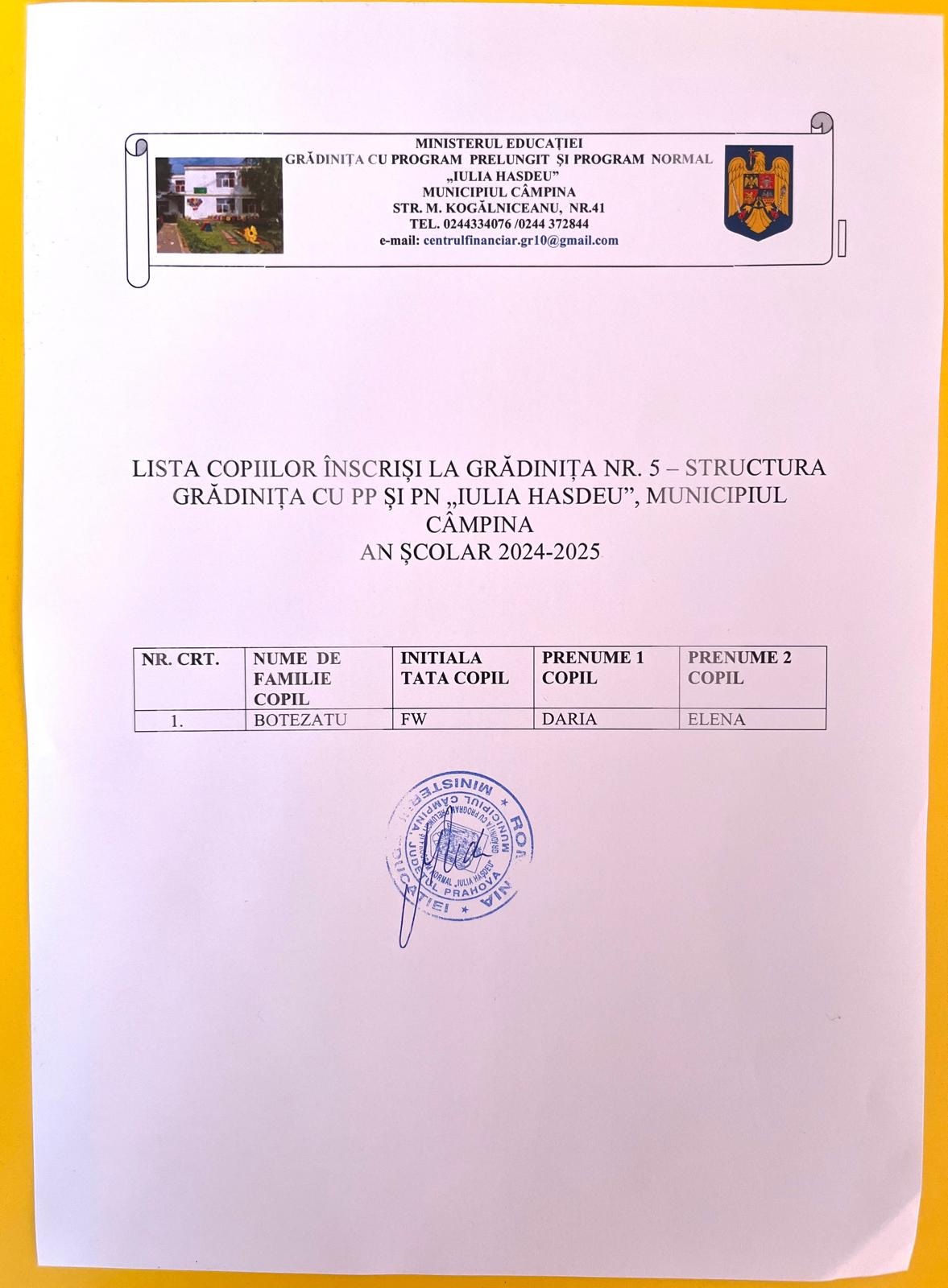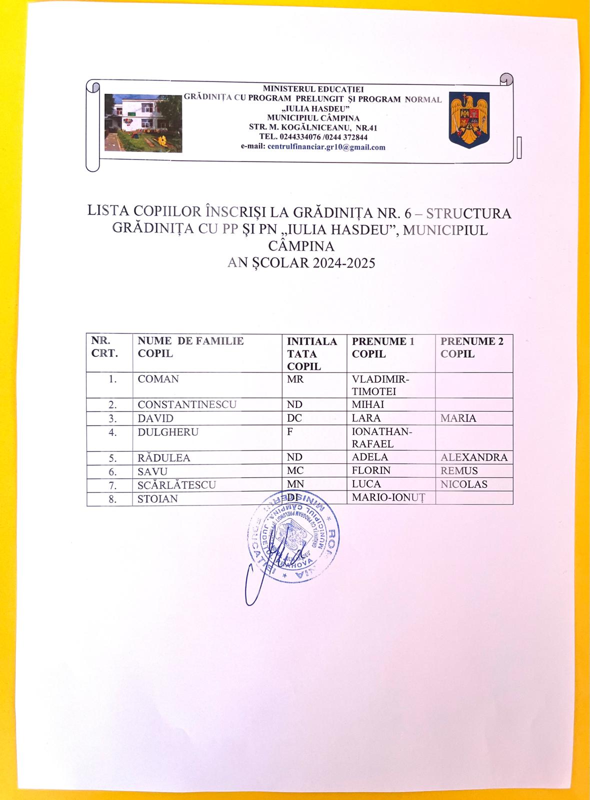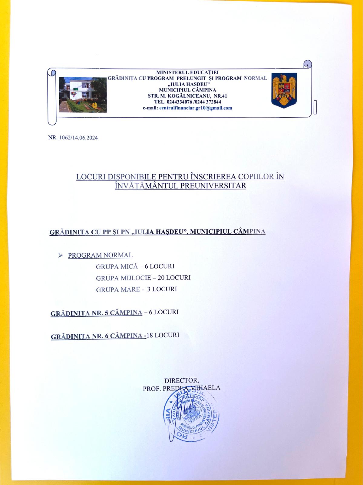 LISTA COPIILOR ADMISI LA GRADINTA IN ANUL ȘCOLAR 2024-2025 și LOCURILE DISPONIBILE PENTRU ANUL ȘCOLAR 2024-2025, ETAPA a II-a.
